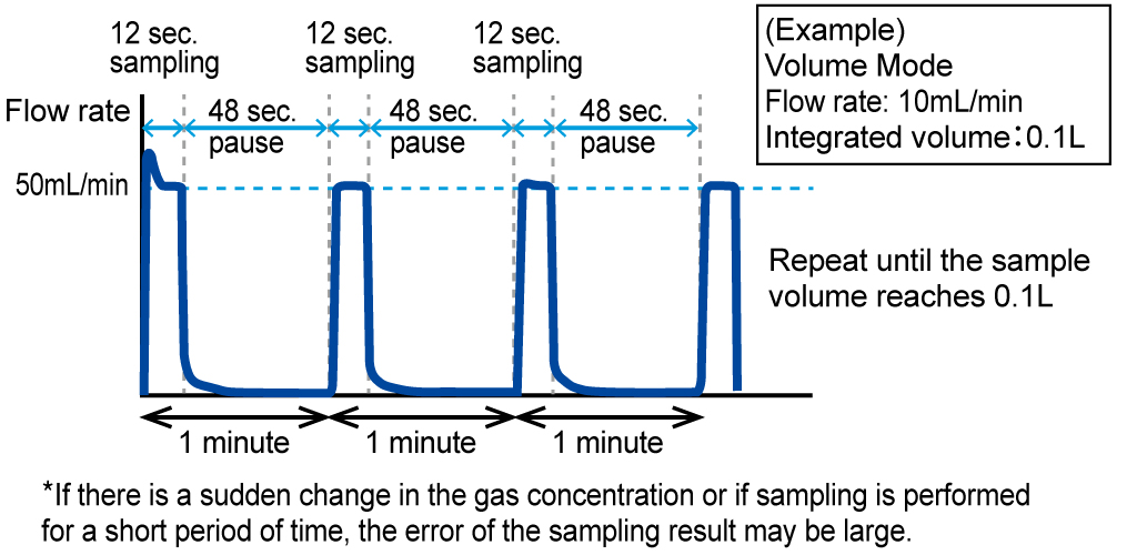 Khi Chế độ âm lượng được chọn và tốc độ dòng chảy được đặt thành 10 mL/phút và thể tích được đặt là 0,1L, sau khi bắt đầu lấy mẫu, bơm sẽ tạm dừng trong khoảng 48 giây sau khoảng 12 giây lấy mẫu tại tốc độ dòng chảy 50mL/phút (lấy mẫu cho đến khi thể tích lấy mẫu mỗi phút đạt 10mL, sau đó tạm dừng). Việc lấy mẫu ở tốc độ dòng chảy 50 mL/phút trong khoảng 12 giây và tạm dừng trong khoảng 48 giây được lặp lại cho đến khi đạt được thể tích đã đặt là 0,1 L, mất khoảng 10 phút.